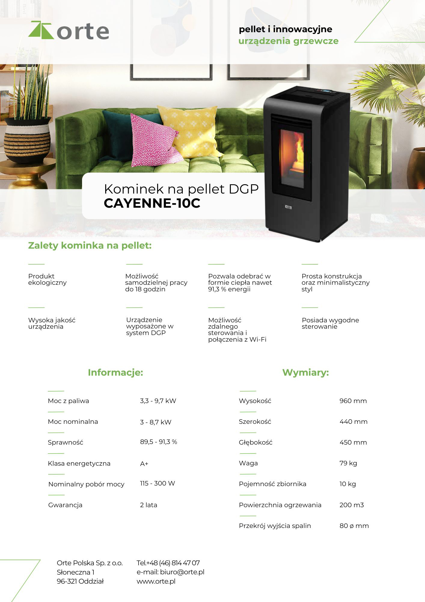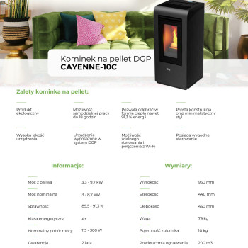 Kominek na pellet CAYENNE to wysokosprawne urządzenie o maksymalnej mocy 8,7 kW. Kominek CAYENNE posiada wbudowany zbiornik o pojemności 10 kg, a jego autonomia pracy wynosi do 18 godzin. Model CAYENNE osiąga nawet do 91,3% sprawności cieplnej.