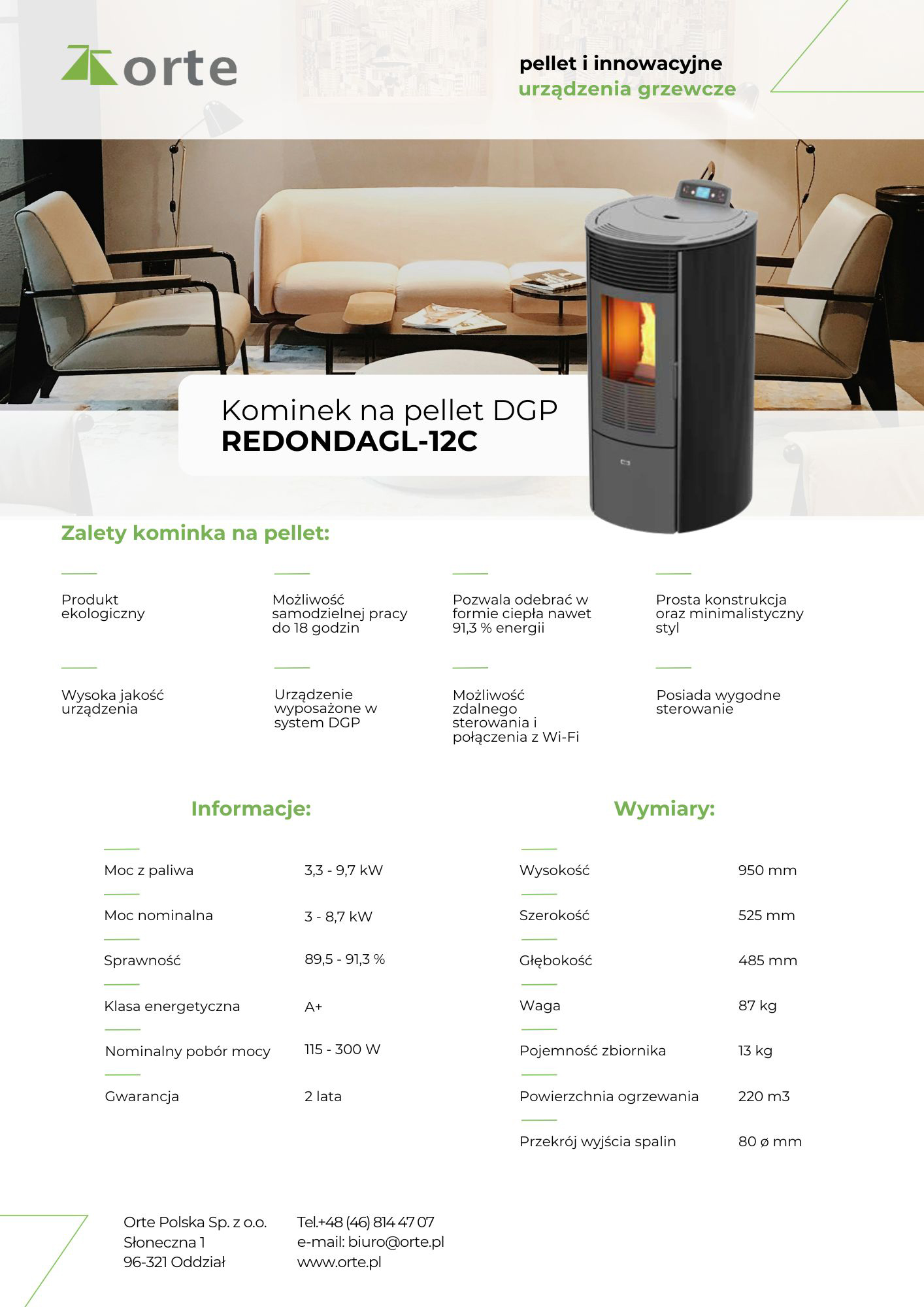 Kominek na pellet REDONDAGL to wysokosprawne urządzenie o maksymalnej mocy 8,7 kW. Kominek REDONDAGL posiada wbudowany zbiornik o pojemności 13 kg, a jego autonomia pracy wynosi do 18 godzin. Model REDONDAGL osiąga nawet do 91,3% sprawności cieplnej.