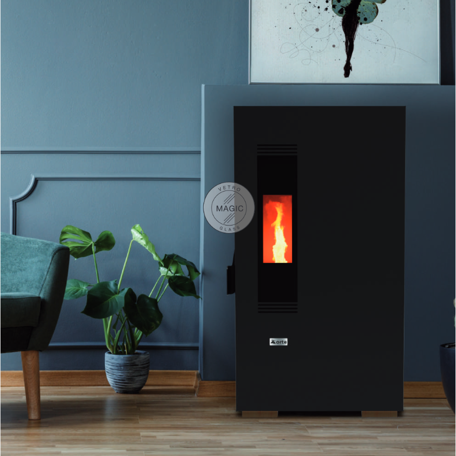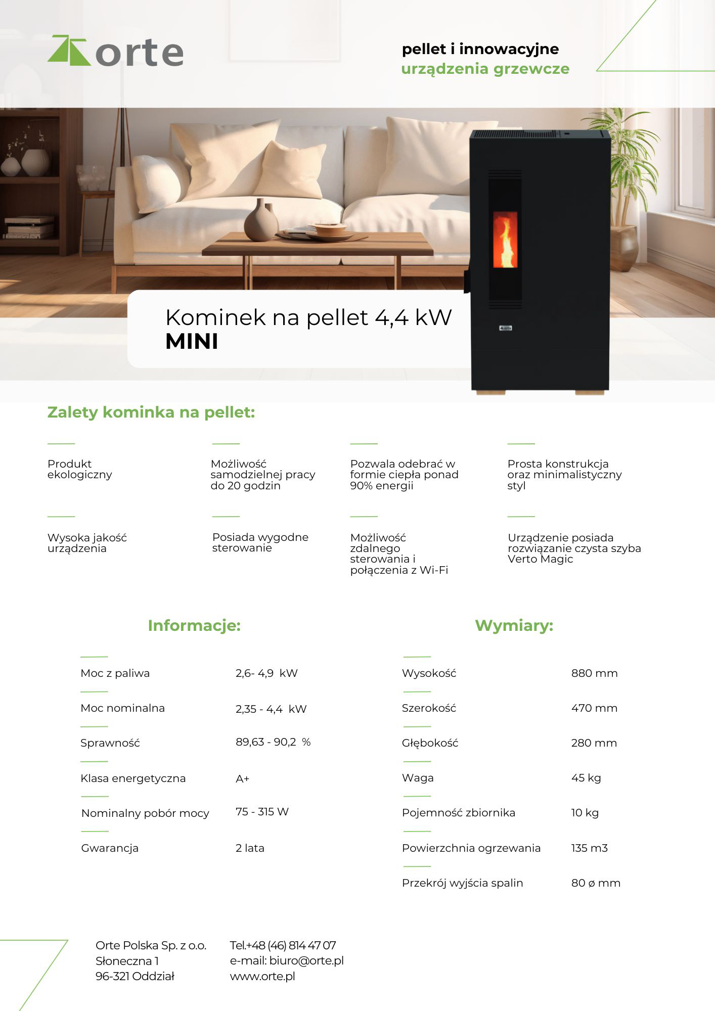 Kominek na pellet MINI to wysokosprawne urządzenie o maksymalnej mocy 4,4 kW. Kominek MINI posiada wbudowany zbiornik o pojemności 10 kg, a jego autonomia pracy wynosi do 20 godzin. Urządzenie zawiera rozwiązanie czysta szyba Verto Magic, które ułatwia utrzymanie kominka w czystości. Kominek wyposażony jest w wyświetlacz LCD, zdalny pilot oraz opcjonalnie w podłączenie Wi-Fi.