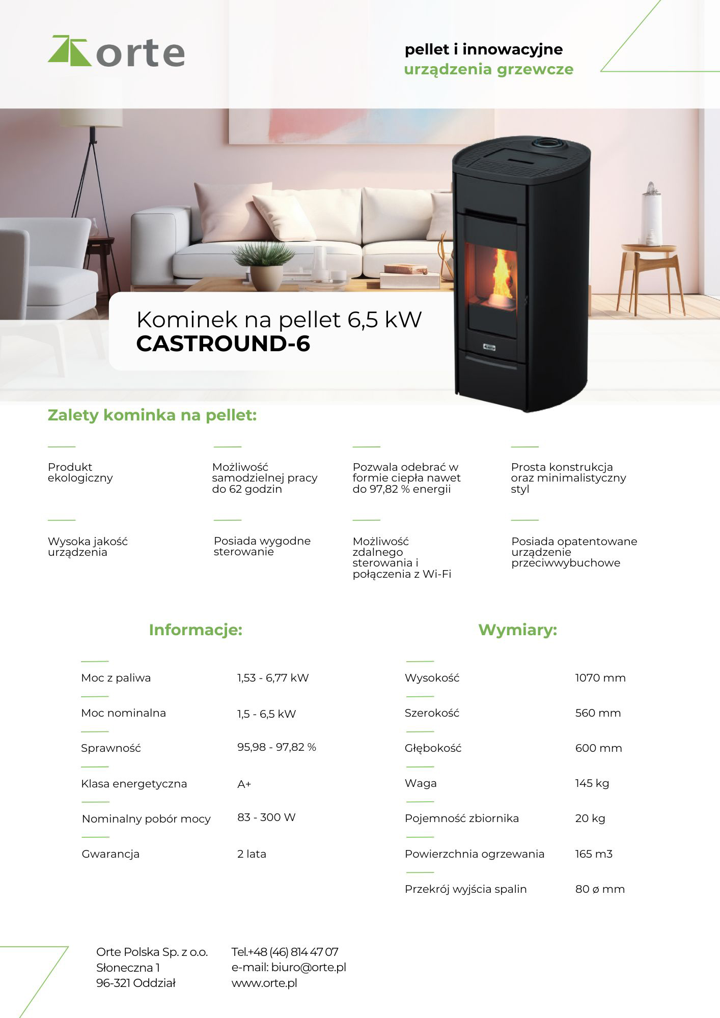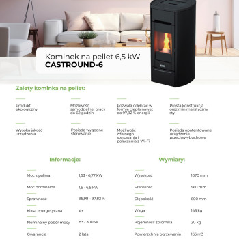 Kominek na pellet CASTROUND model 6 to wysokosprawne urządzenie o maksymalnej mocy 6,5 kW. Kominek CASTROUND posiada wbudowany zbiornik o pojemności 20 kg, a jego autonomia pracy wynosi do 62 godzin. Model CASTROUND osiąga nawet do 97,89% sprawności cieplnej.