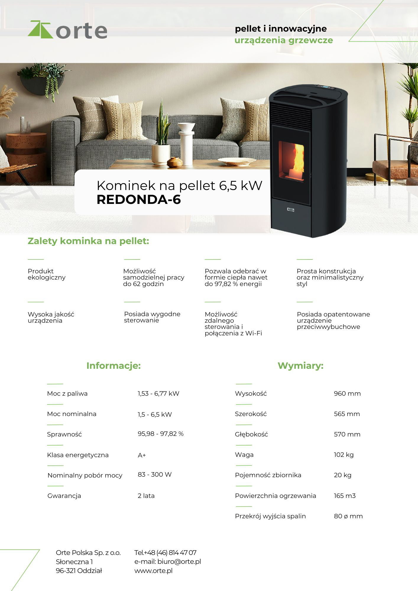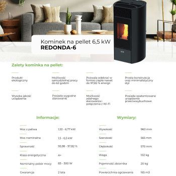 Kominek na pellet REDONDA 6 to wysokosprawne urządzenie o maksymalnej mocy 6,5 kW. Kominek REDONDA posiada wbudowany zbiornik o pojemności 20 kg, a jego autonomia pracy wynosi do 62 godzin. Model REDONDA osiąga nawet do 97,82% sprawności cieplnej.