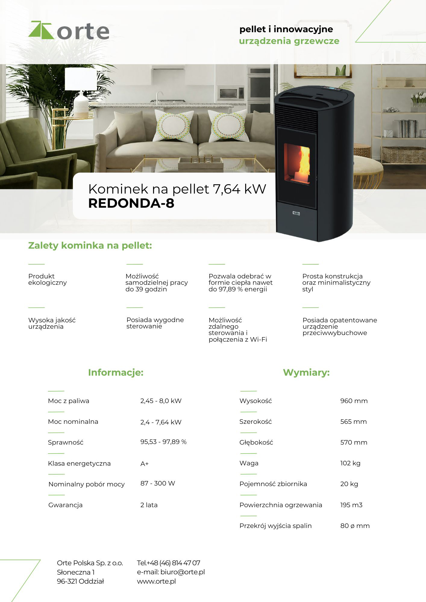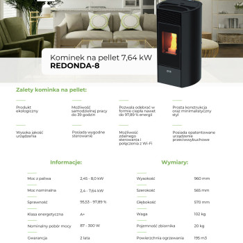 Kominek na pellet REDONDA 8 to wysokosprawne urządzenie o maksymalnej mocy 7,64 kW. Kominek REDONDA posiada wbudowany zbiornik o pojemności 20 kg, a jego autonomia pracy wynosi do 39 godzin. Model REDONDA osiąga nawet do 97,89% sprawności cieplnej.