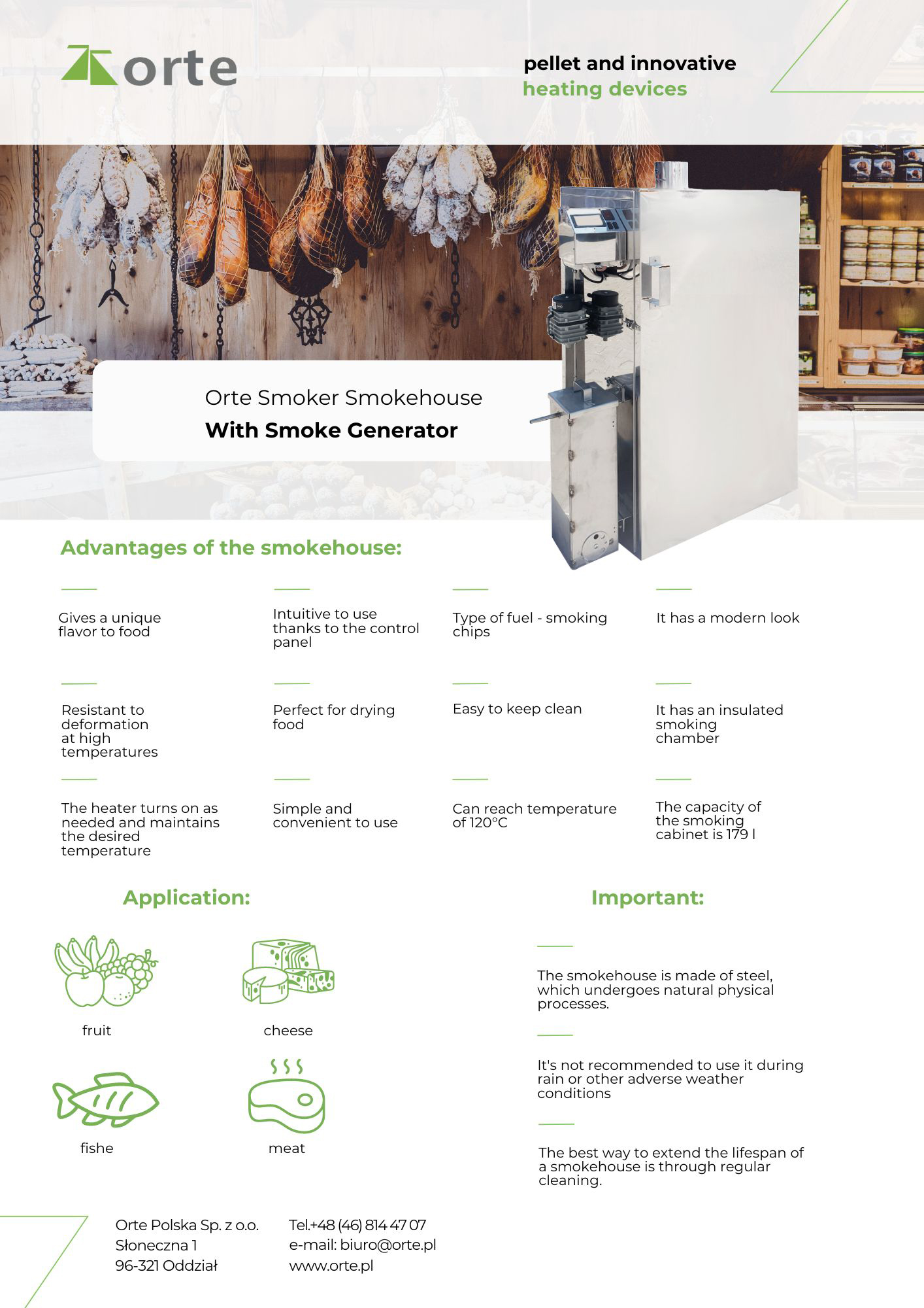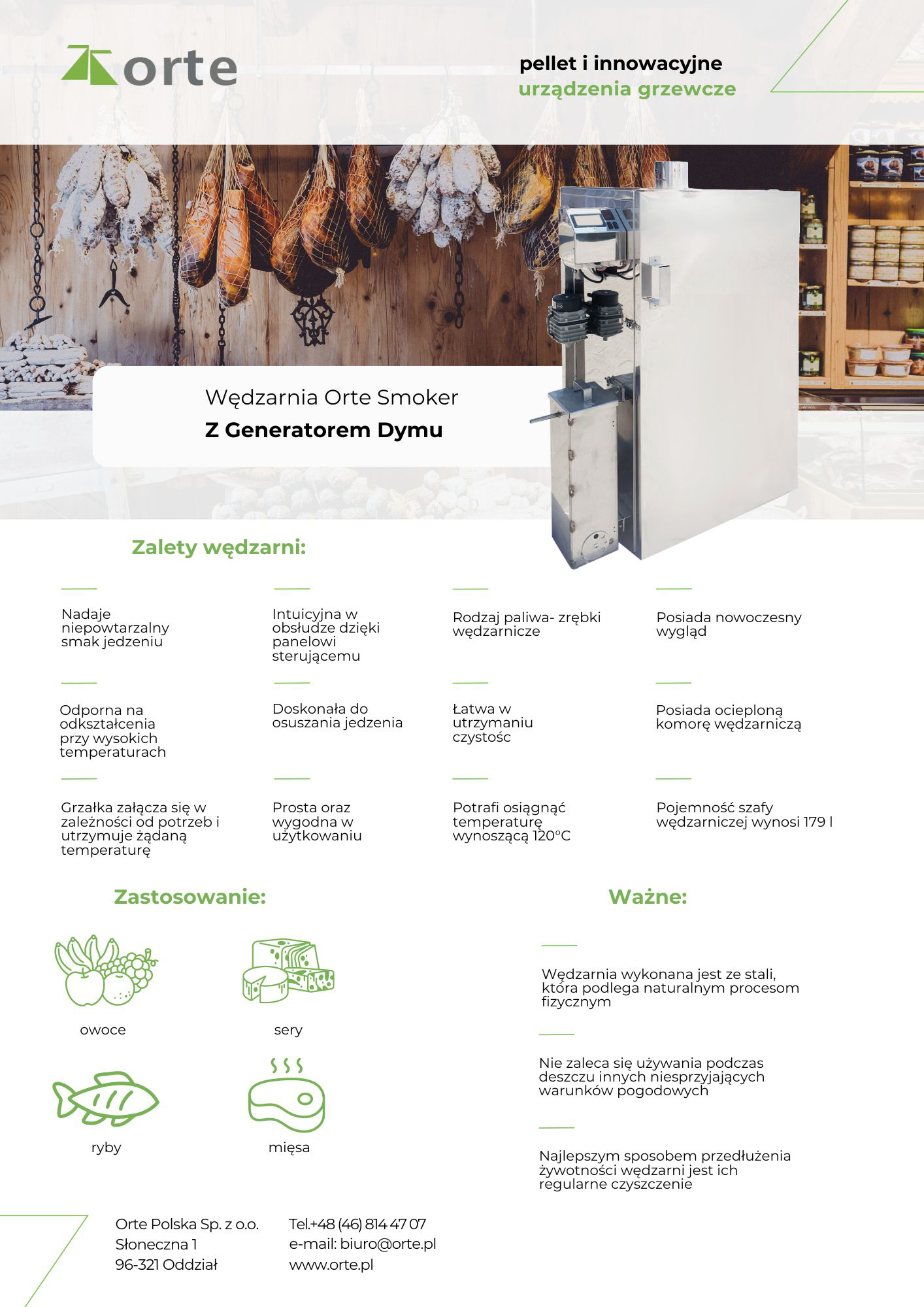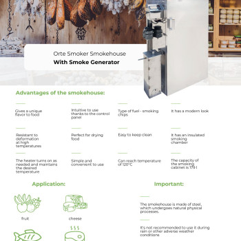 Wędzarnia Orte Smoker S03 to nasze autorskie rozwiązanie. Wędzarnia zawiera 9 prowadnic i 3 grzałki. Pojemność szafy wędzarniczej wynosi 1050 L.